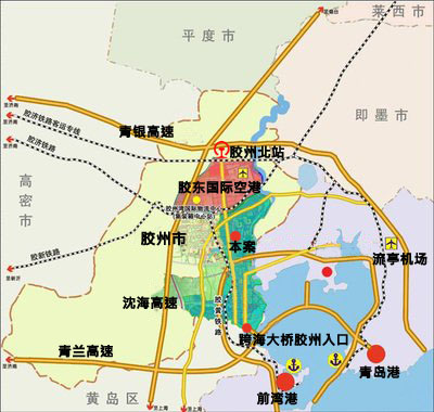 大厦区位优势明显,地理位置优越,交通便利,四通八达:距离青岛地铁8号线胶东站4公里;距胶州北站高铁站6公里;往东北5公里直抵胶东4F级国际机场,一步畅达全世界。项目西侧是站前大道,机场启动后将作为机场快速路,成为青岛市的主要交通干线之一;沿站前大道南下,约15分钟到达中国—上海合作组织地方经贸合作示范区。另外,胶州湾跨海大桥胶州连接线施工已经接近尾声,大桥开通后,本案到青岛驱车大约25分钟,完全纳入到青岛半小时经济圈。